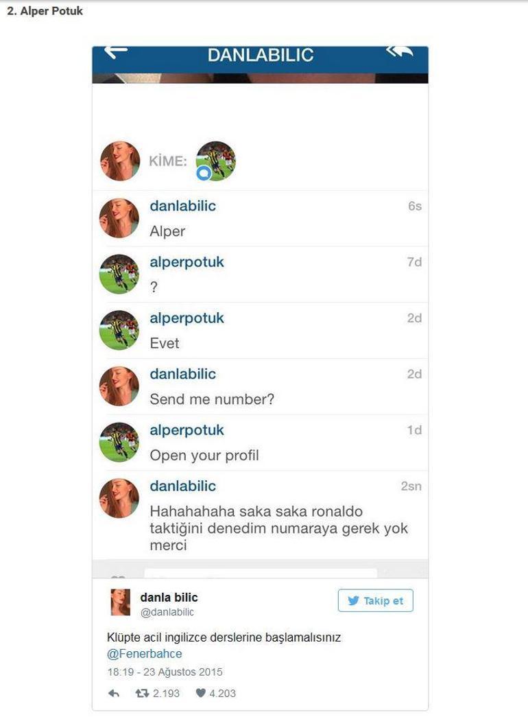 Alper Potuk A Sosyal Medyada Danla Bilic Uyarisi. Sosyal medya sayfasından alper potuk, yusuf erdoğan, emre çolak gibi yıldız futbolculara attığı mesajlarla olay yaratan danla bilic, ünlü olma hikayesini şu sözlerle ifade etti: Futbolcu meselem var herkesin bildiği. Ondan sonra kezban diyince kiziyosunuz aq. Şimdi bana kızacaklar ama k.ş.rlık yaptım. Bir fenerbahçeli taraftarın isteği ise şöyle: Emre colak beni takip etti, alper potuk bana 2 satir mesaj yazdi. Tümü | bugün sorunsallar (2). Instagram hesabından alper potuk, yusuf erdoğan, emre çolak gibi yıldız futbolculara attığı mesajlarla olay yaratan danla bilic, ünlü olma hikayesini şu sözlerle anlattı: Instagram hesabından alper potuk, yusuf erdoğan, emre çolak gibi yıldız futbolculara attığı. Danla bilic'in bu paylaşımlarının ardından taraftarlardan da özel istekler gelmeye de başladı. Taraftarlar sadece danla bilic'ten değil, bu tuzağa düşen futbolculardan da isteklerini dile getirmekten çekinmiyorlar. Çektiği makyaj videolarıyla tanınan youtuber danla bilic çektiği makyaj videolarıyla tanınan youtuber danla bilic, kerimcan durmaz ile birlikte yaptığı programda nasıl ünlü olduğunu anlattı. Normal mi lan bu simdi ??? Futbolcu meselem var herkesin bildiği. Sosyal medyada yayınladığı makyaj videolarıyla tanınan youtuber danla bilic, kerimcan durmaz ile birlikte yaptığı programda nasıl ünlü olduğunu anlattı.